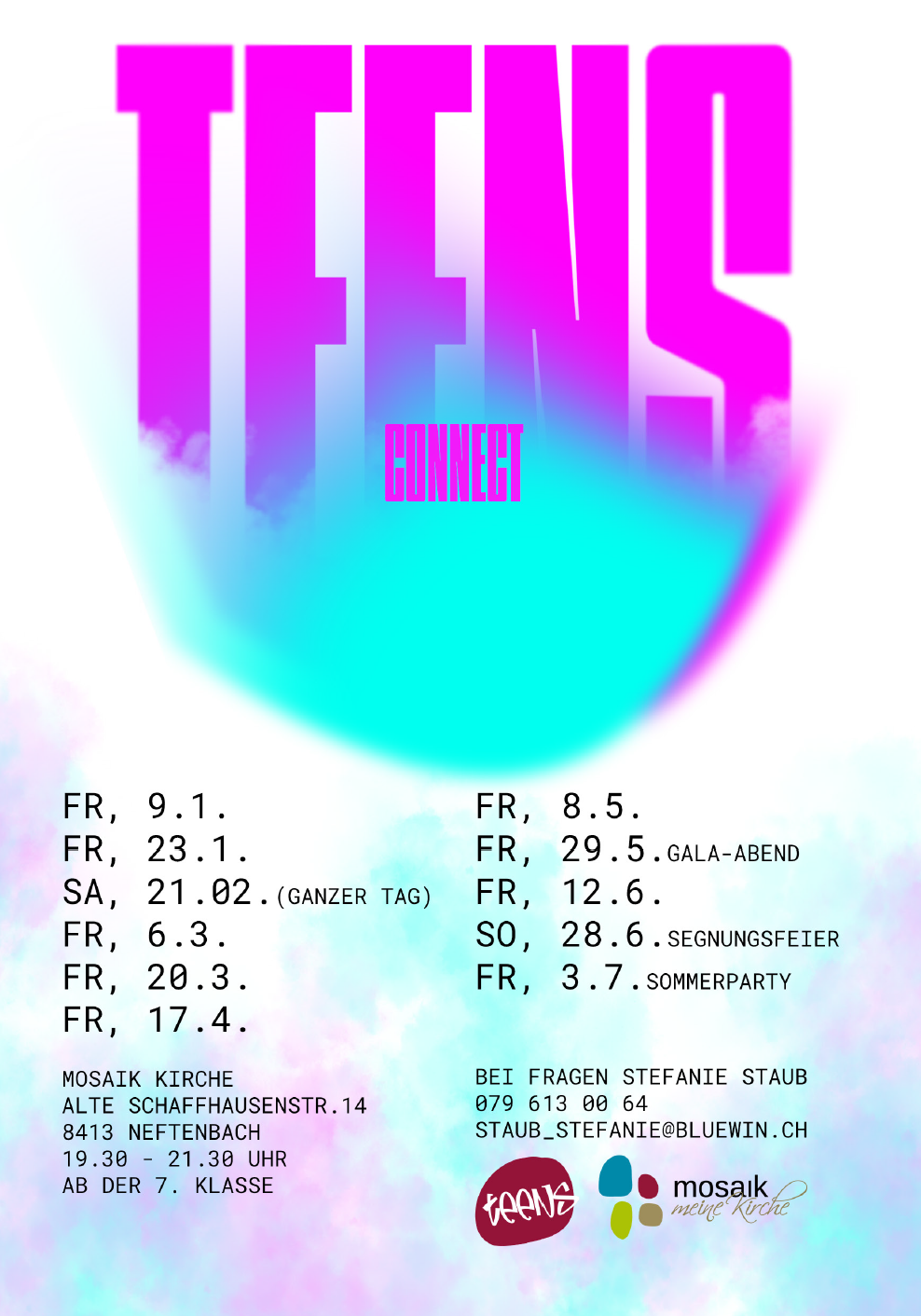 Teens, welche sich in der 6.-8. Klasse befinden, treffen sich parallel zum Gottesdienst zu einem separaten Programm. Biblische und aktuelle Themen, welche die Teens direkt betreffen, stehen im Zentrum.