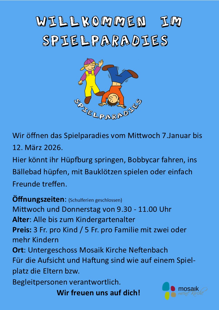 Fragen bitte direkt an: Priska Flach, rpflach@gmx.net (Leiterin Spielparadies) oder im Mosaik-Büro anrufen: 052 315 20 33